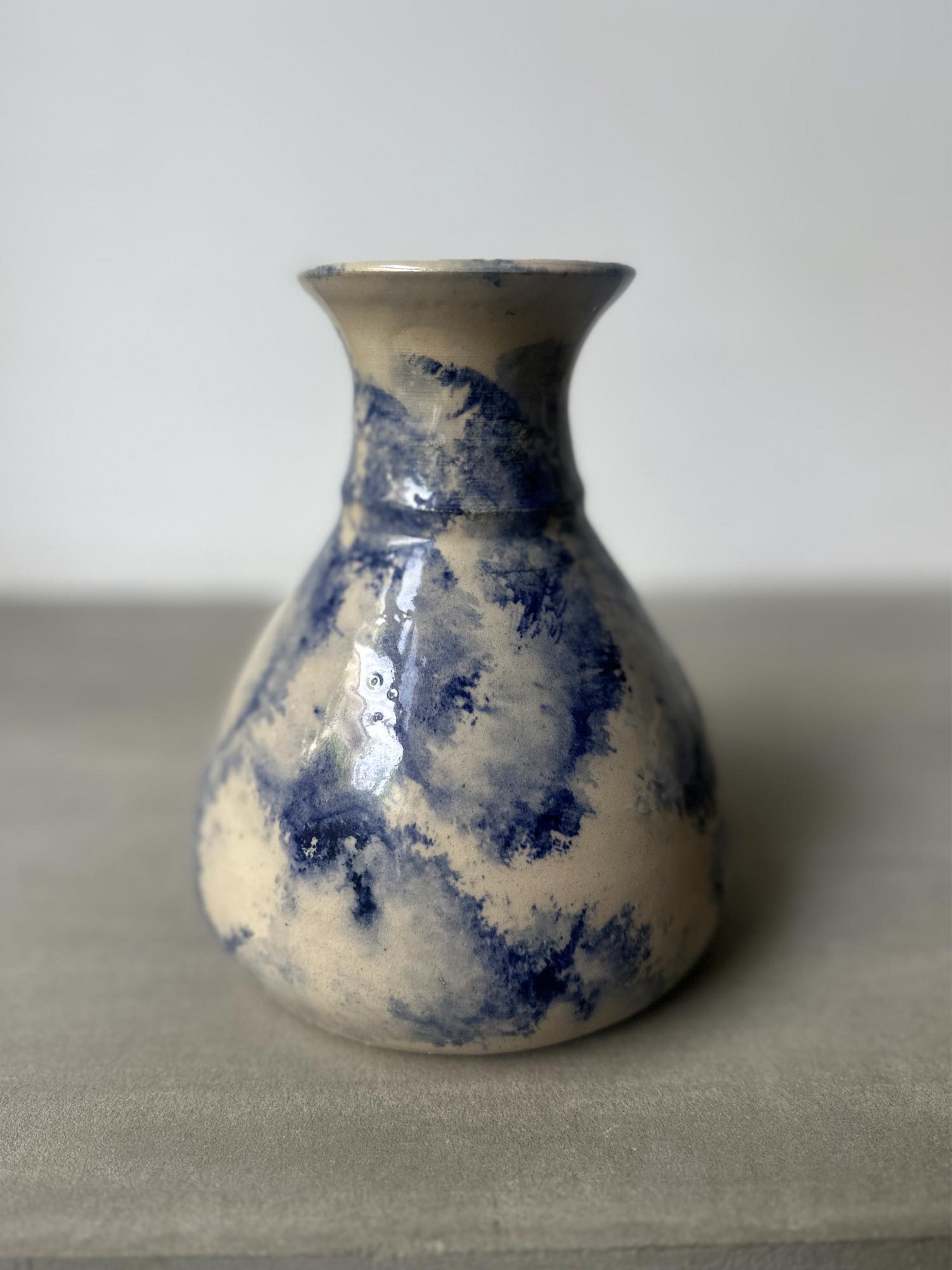 Softly sculptural and quietly expressive, this wheel thrown vase is crafted from white clay and finished with a flowing blue glaze that drifts gently across its surface. The organic patterning makes each piece entirely one-of-a-kind.