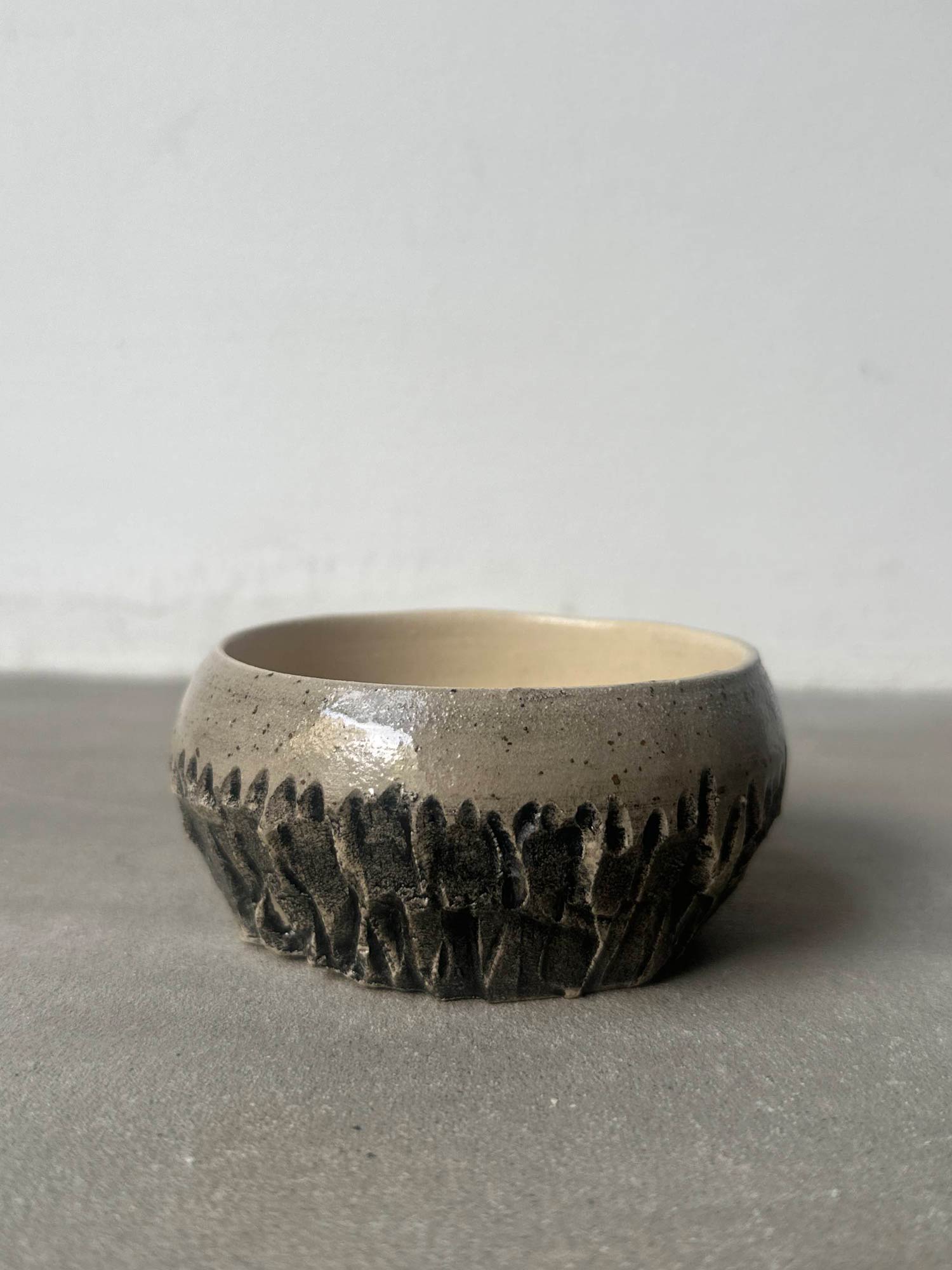 This handmade stoneware bowl features a striking contrast between its smooth, lightly speckled upper surface and its deeply carved, tactile lower section. The natural clay body reveals warm beige tones on top that transition into darker, charcoal-textured cuts around the base, creating an organic, sculptural effect.