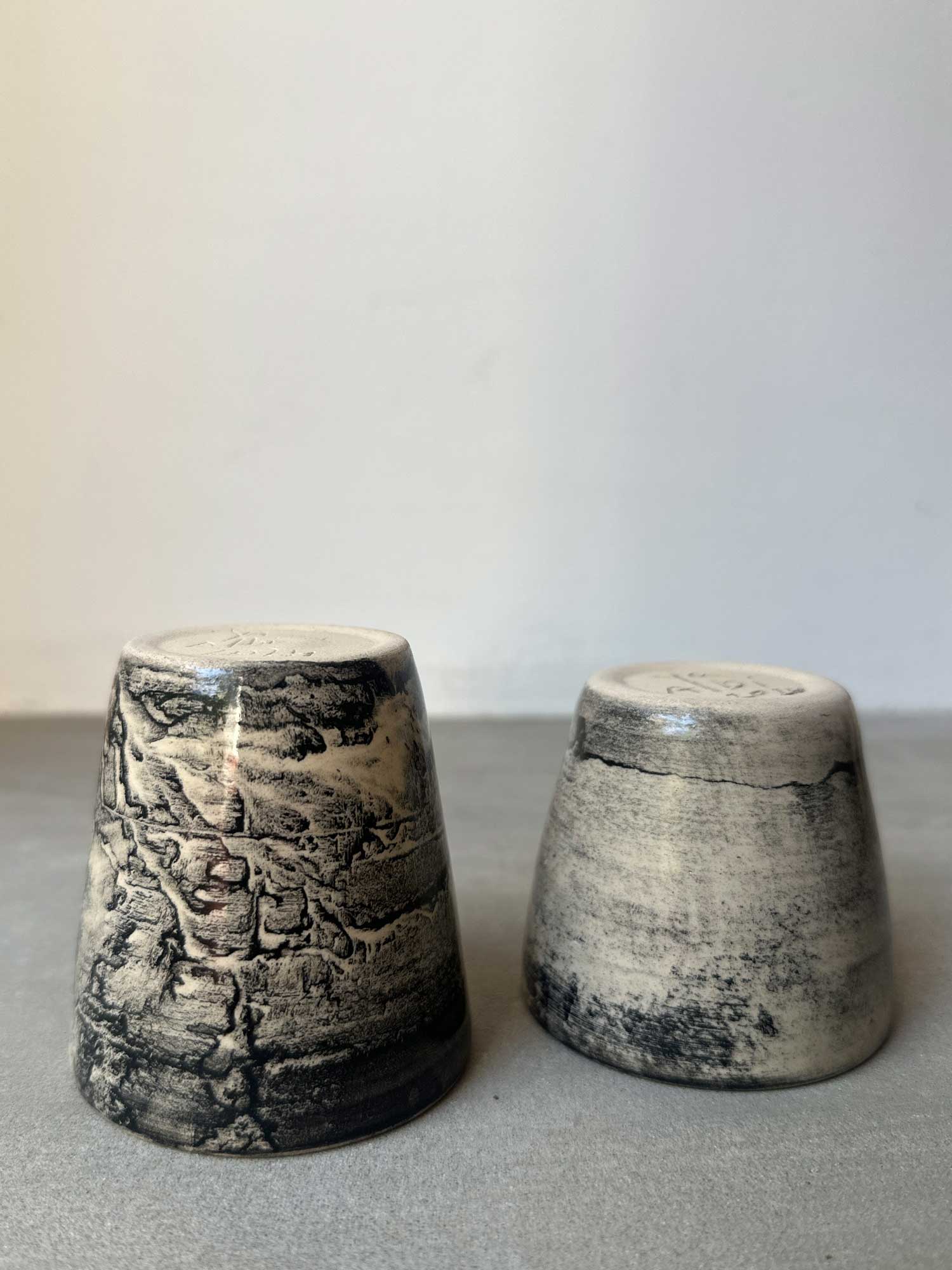 This pair of cups has a natural, earthy charm. Each one is shaped by hand and finished with a smoky, marbled surface that makes them feel organic and unique. The soft black and clay tones create a calm, textured look, with subtle differences between the two that show their handmade character.