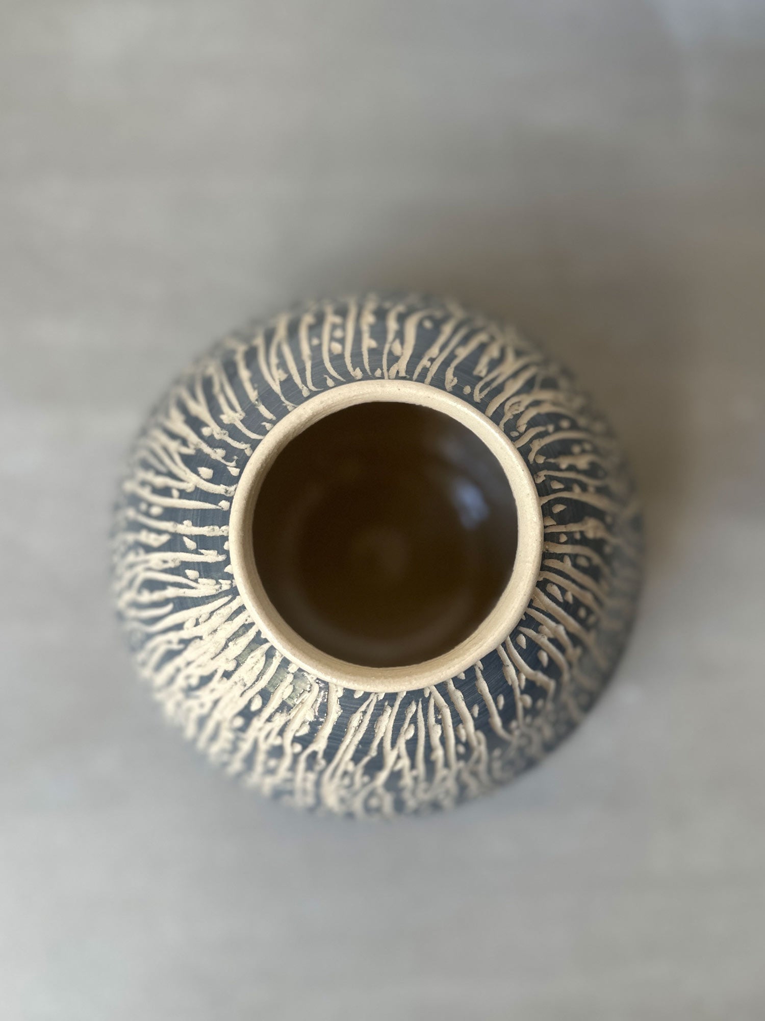 The raw clay revealed through the carving creates a contrast, giving the piece a tactile, earthy presence. Inside, the vase is smoothly glazed, making it functional while still celebrating its handcrafted spirit.