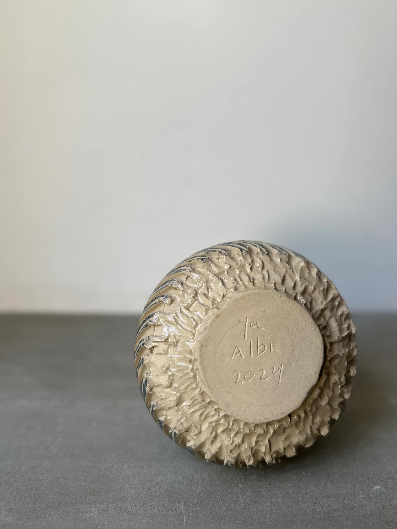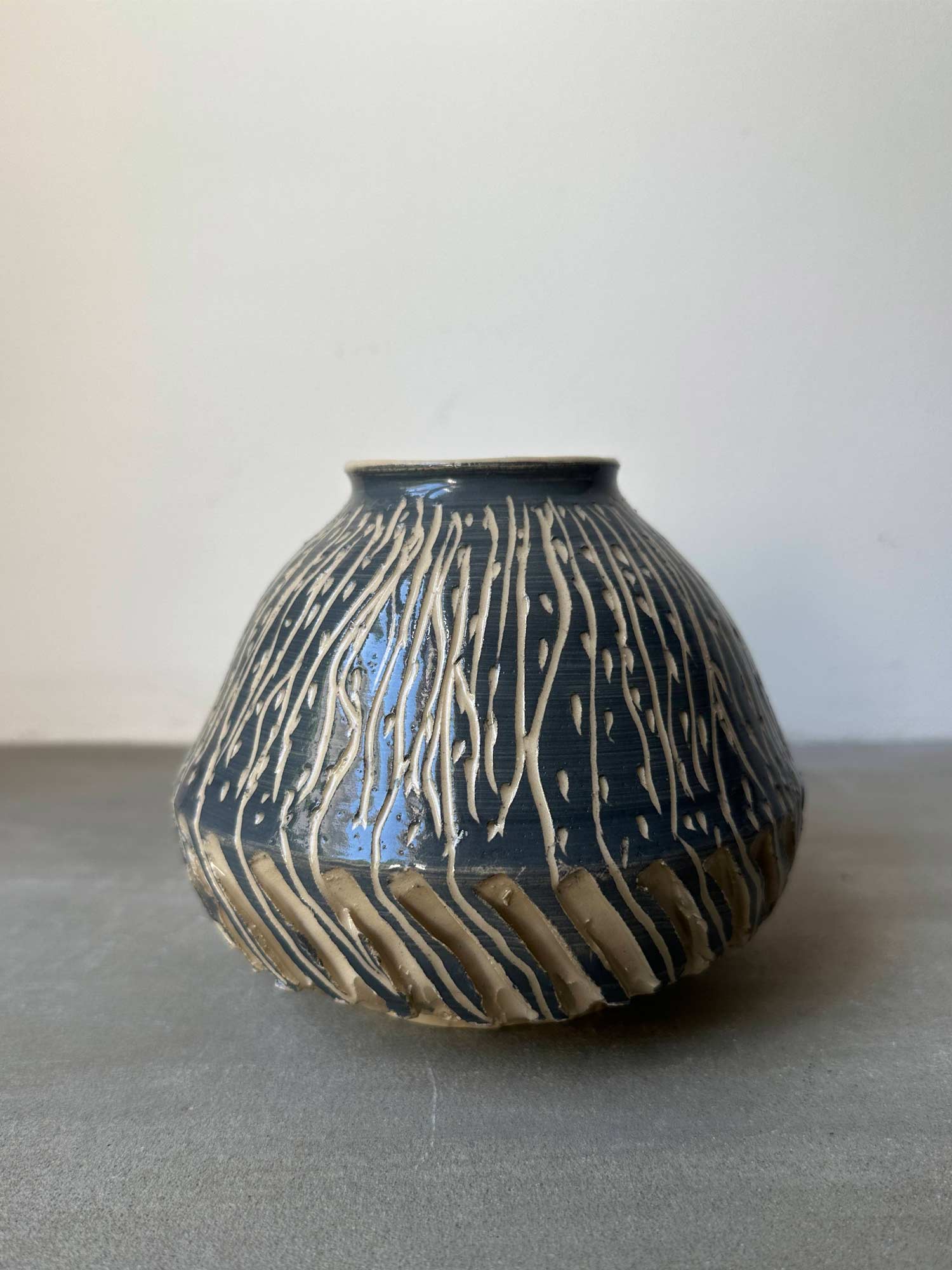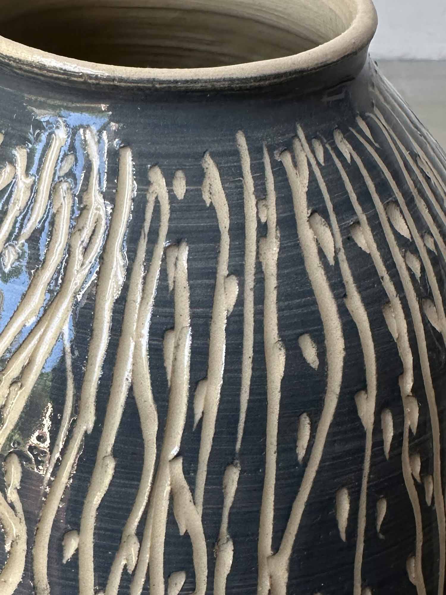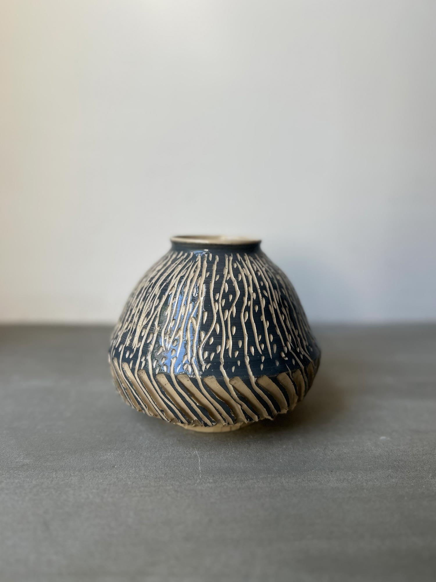 This sculptural vase is a one of a kind piece, shaped on the wheel and finished with hand carved lines that flow organically around the form. The pattern brings a sense of movement like roots, rain, or rising threads—adding depth and character to surface.