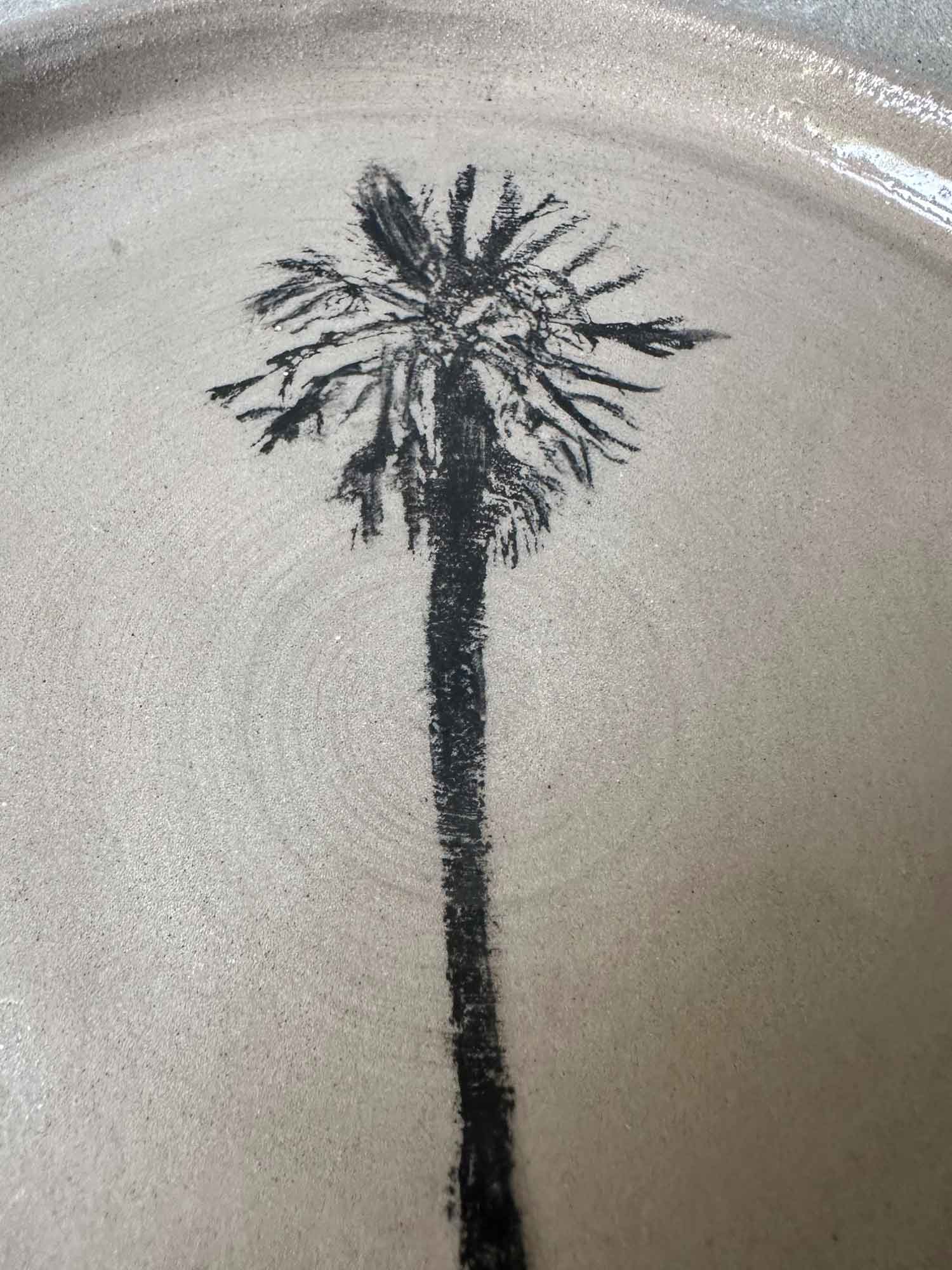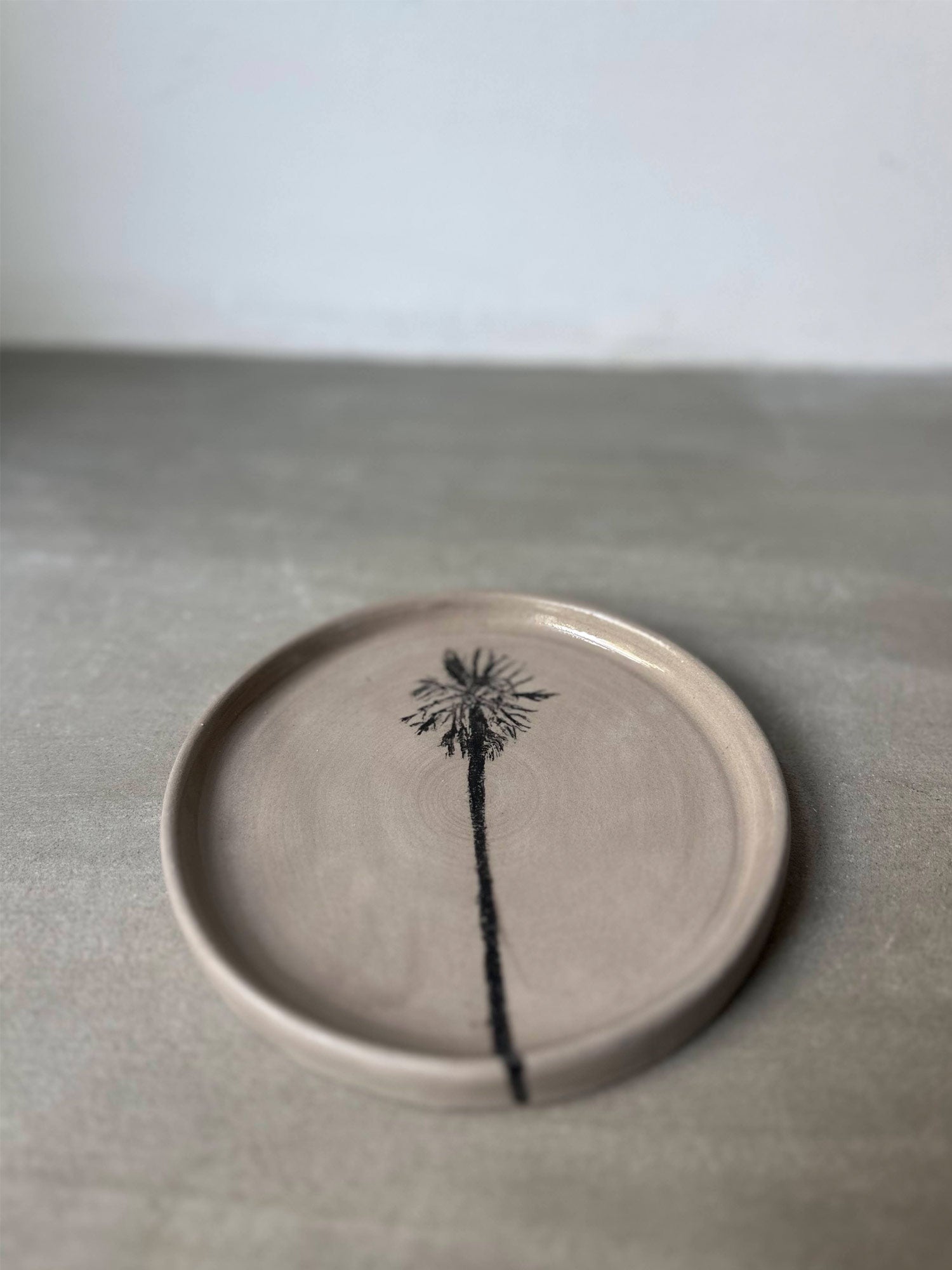 This handmade stoneware plate features a soft, natural clay tone and a printed photo combined with hand-painted palm motif. The thin black line rises from the rim toward the center, ending in a loose, expressive palm silhouette. The design feels minimal yet artistic.