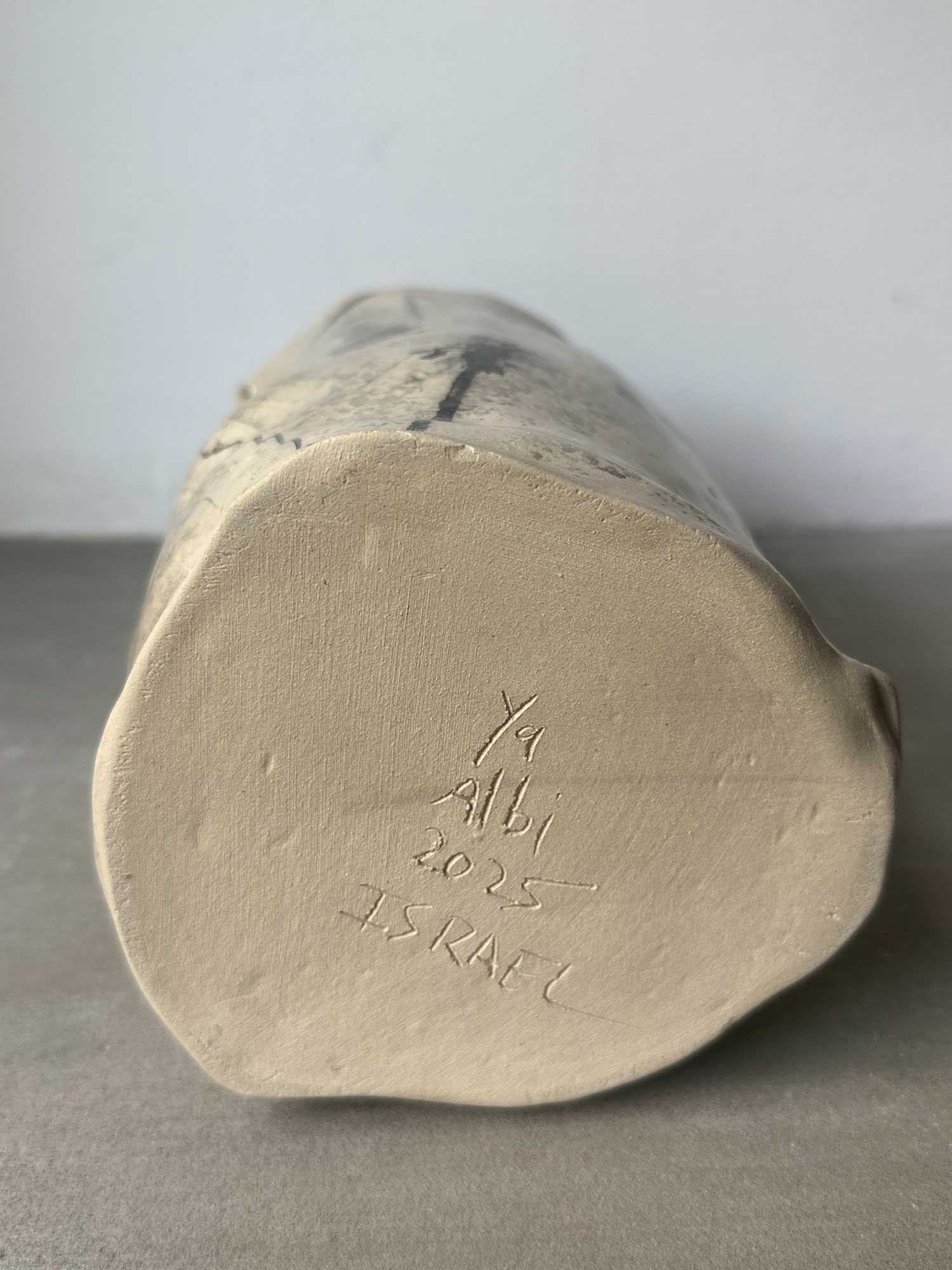 White clay with hand-drawn black imagery